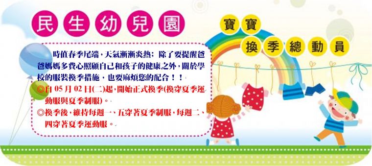 時值春季尾端,天氣漸漸炎熱;除了要提醒爸爸媽媽多費心照顧自己和孩子的健康之外,關於學校的服裝換季措施,也要麻煩您的配合!!